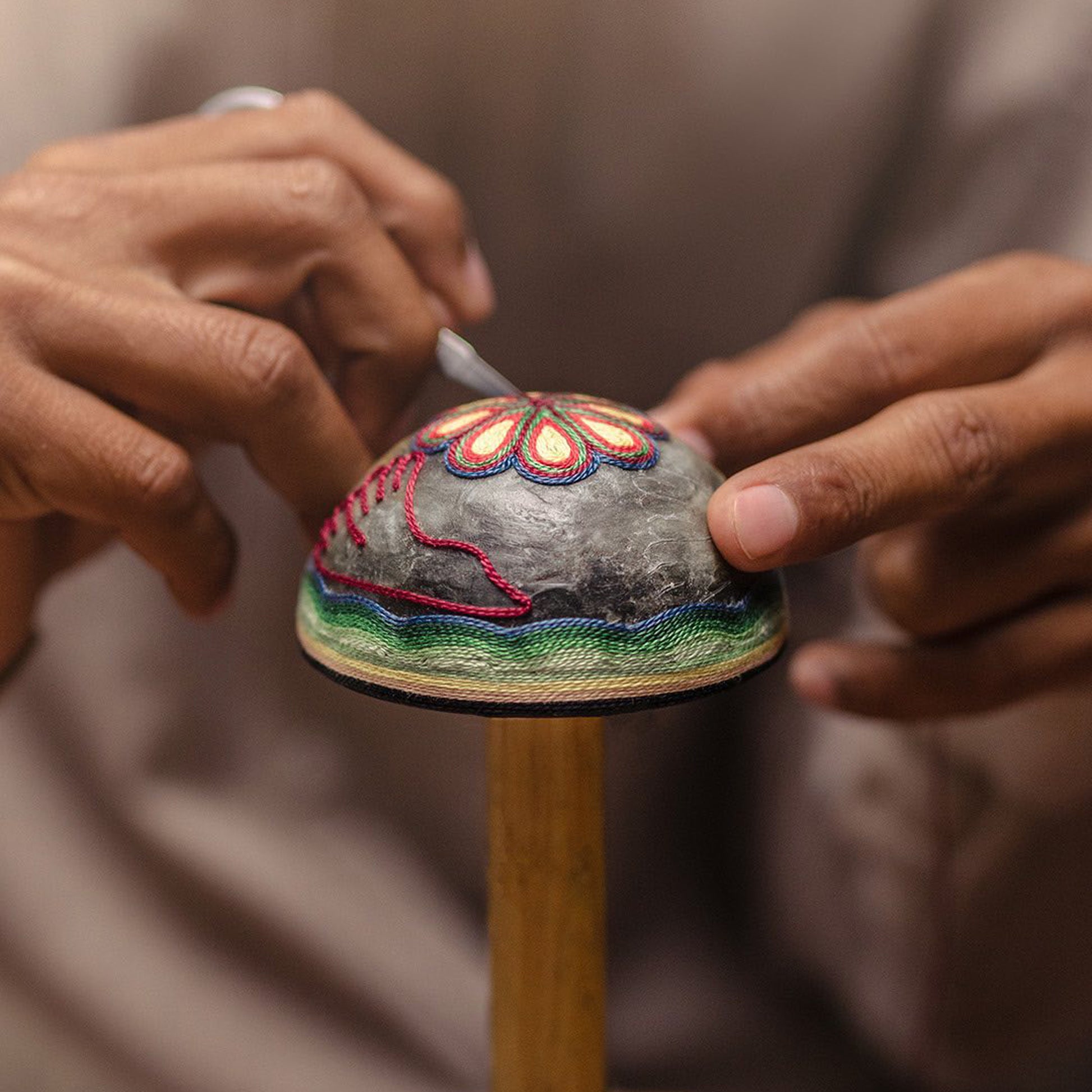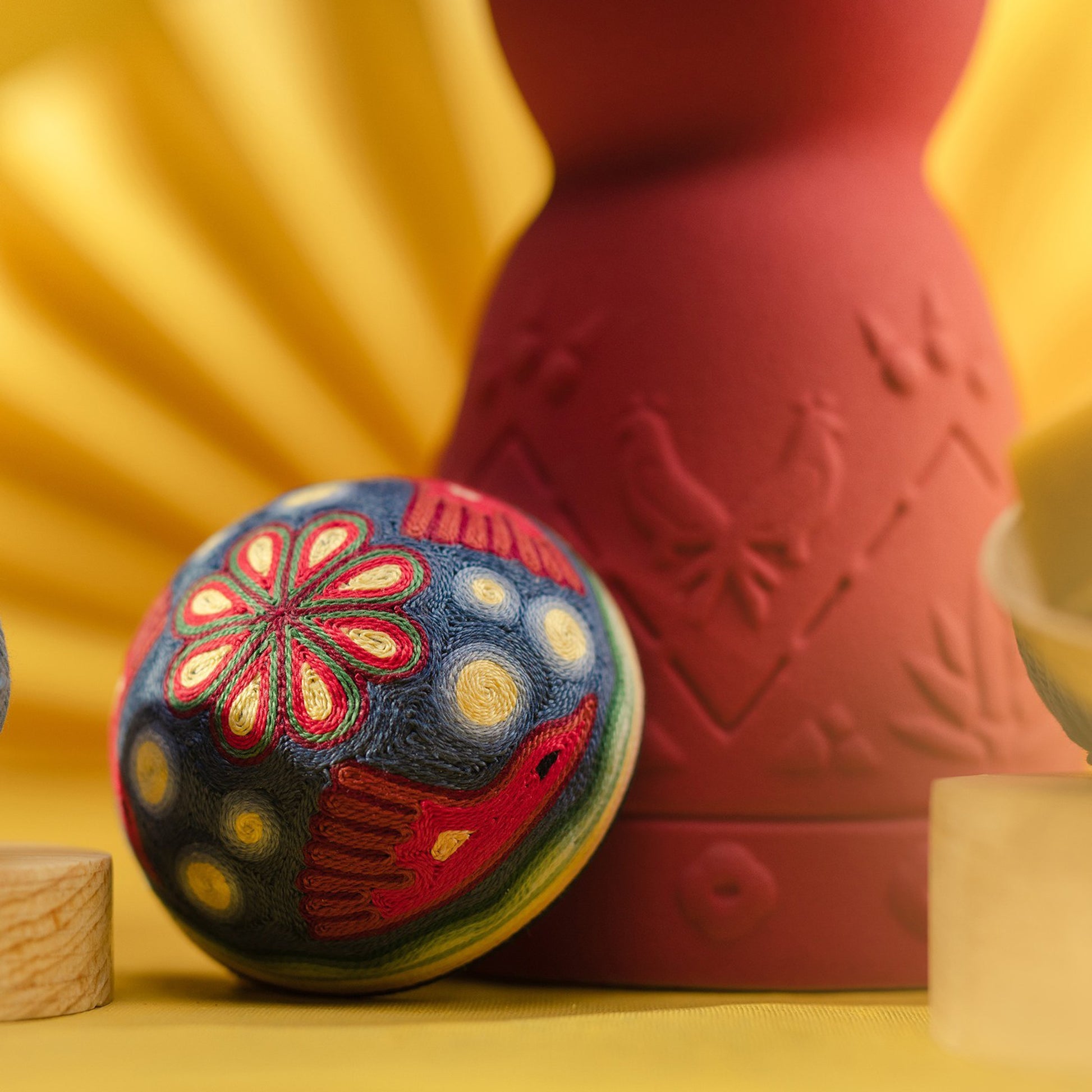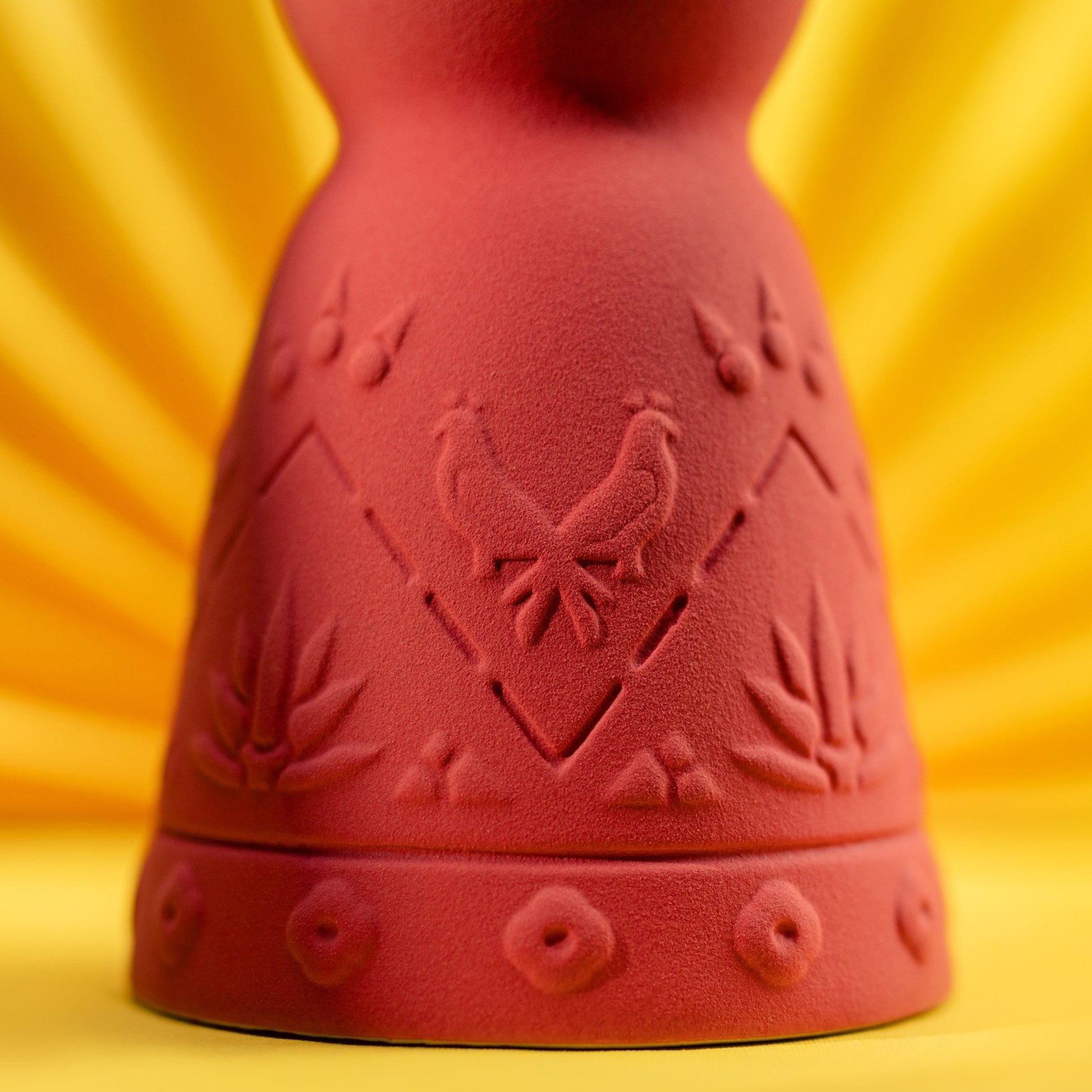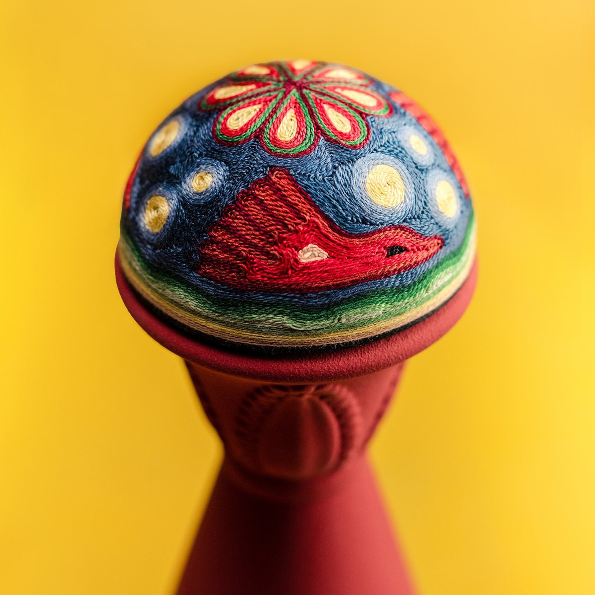 The decanter itself is a work of art, hand-carved by artisans from a small community of the Mazahua people, the design on this special piece evokes a sense of timelessness and cultural heritage. Adding a vibrant touch to the decanter is the unique and colourful cap, crafted by artisans from the Wixárika culture. Handmade using a technique of coloured yarn appliqué, the decanter’s cap represents a beautiful desert landscape of mountains and valleys overflown by bright red finches. Each piece requires over three hours of meticulous craftsmanship from our artisans.
